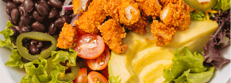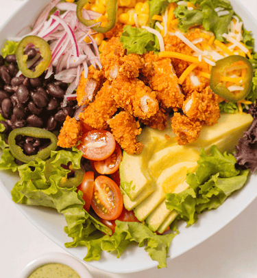 Lechuga americana orgánica, strips de pollo en trozos, tomates cherry, maíz tierno, cebolla morada fresca, frijoles, mezcla de quesos y chile jalapeño fresco, acompañada con salsa de culantro y pan focaccia.