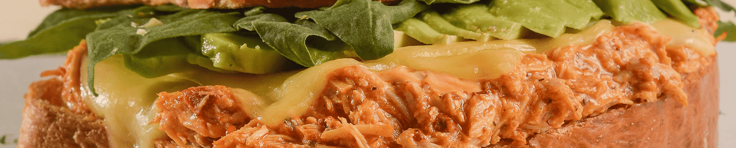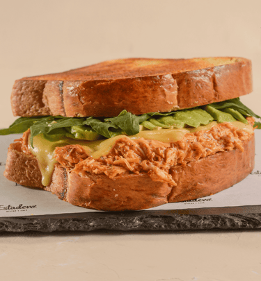 Sandwich de jugoso pollo rostizado con chiles chipotles, queso Monte Rico, aguacate, alioli de ajo y espinaca fresca sobre nuestro suave pan blanco artesanal.