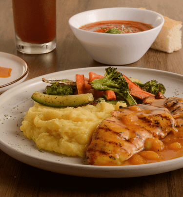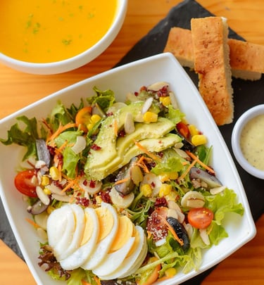 Tu ensalada favorita con ingredientes siempre frescos acompañada con la crema del día y pan focaccia Estadero.