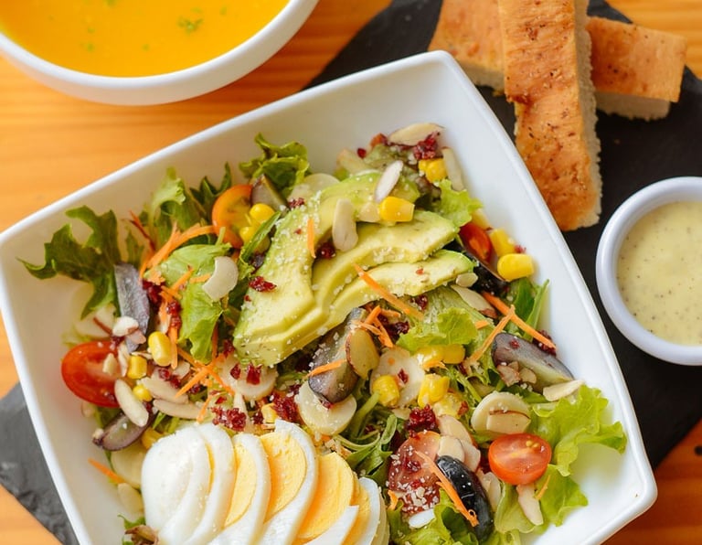 Mezclum de lechugas frescas orgánicas, tomate cherry, palmito, huevo cocido, aguacate, uvas, maíz tierno, arándanos secos, zanahoria, almendras y queso parmesano, acompañada con nuestro aderezo de cebolla dulce y pan focaccia.