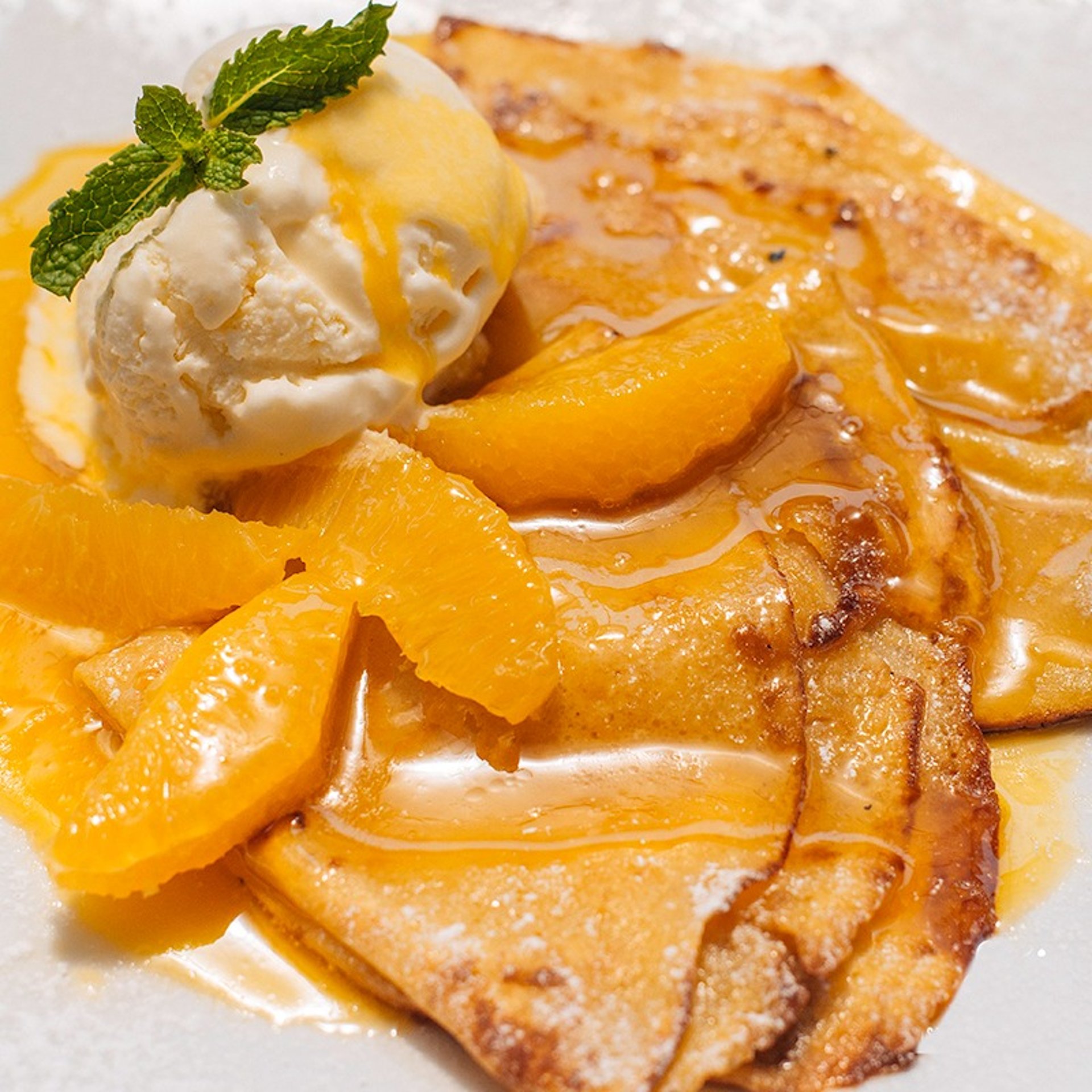 Rellenas de mantequilla de naranja, licor de naranja y flambeadas en ron Flor de Caña, servidas con gajos de naranja y helado de vainilla.